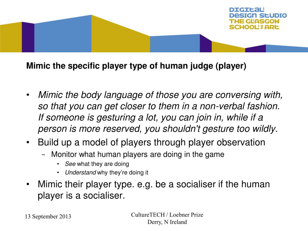 Mimic the specific player type of human judge (player) • Mimic the body language of those you are conversing with, so that you can get closer to them in a non-verbal fashion. If someone is gesturing a lot, you can join in, while if a person is more reserved, you shouldn't gesture too wildly. • Build up a model of players through player observation • Monitor what human players are doing in the game • See what they are doing • Understand why they’re doing it • Mimic their player type. e.g. be a socialiser if the human player is a socialiser.