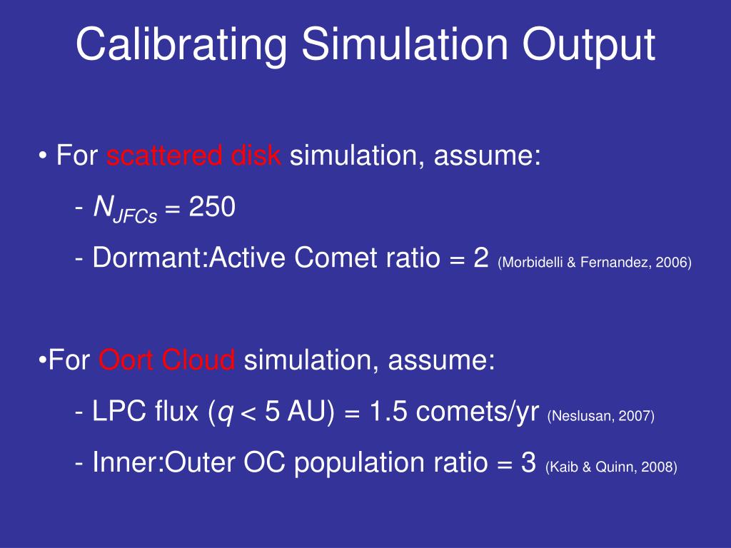 Calibrating Simulation Output • For scattered disk simulation, assume: • NJFCs = 250 • Dormant:Active Comet ratio = 2 (Morbidelli & Fernandez, 2006) • For Oort Cloud simulation, assume: • LPC flux (q < 5 AU) = 1.5 comets/yr (Neslusan, 2007) • Inner:Outer OC population ratio = 3 (Kaib & Quinn, 2008)