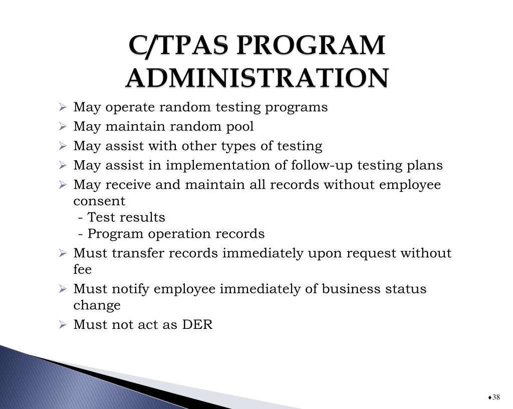 C/TPAS PROGRAM ADMINISTRATION • May operate random testing programs • May maintain random pool • May assist with other types of testing • May assist in implementation of follow-up testing plans • May receive and maintain all records without employee consent - Test results - Program operation records • Must transfer records immediately upon request without fee • Must notify employee immediately of business status change • Must not act as DER