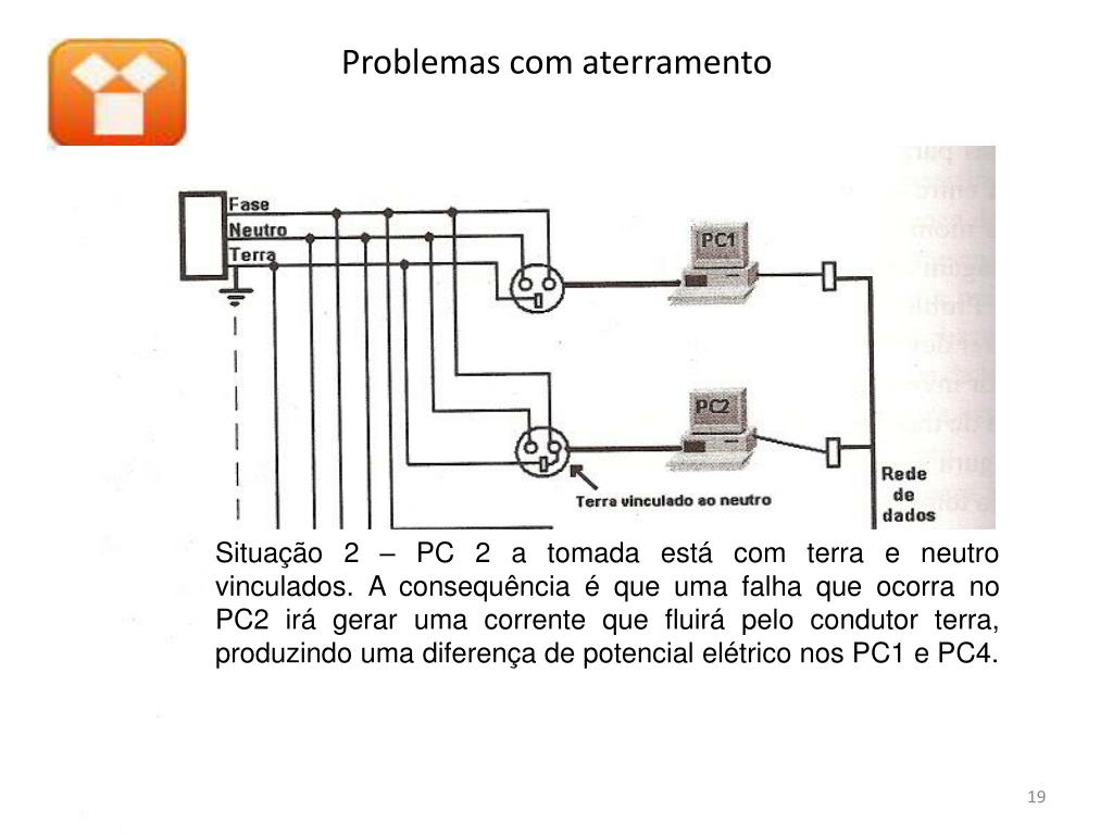 Problemas com aterramento Situação 2 – PC 2 a tomada está com terra e neutro vinculados. A consequência é que uma falha que ocorra no PC2 irá gerar uma corrente que fluirá pelo condutor terra, produzindo uma diferença de potencial elétrico nos PC1 e PC4.