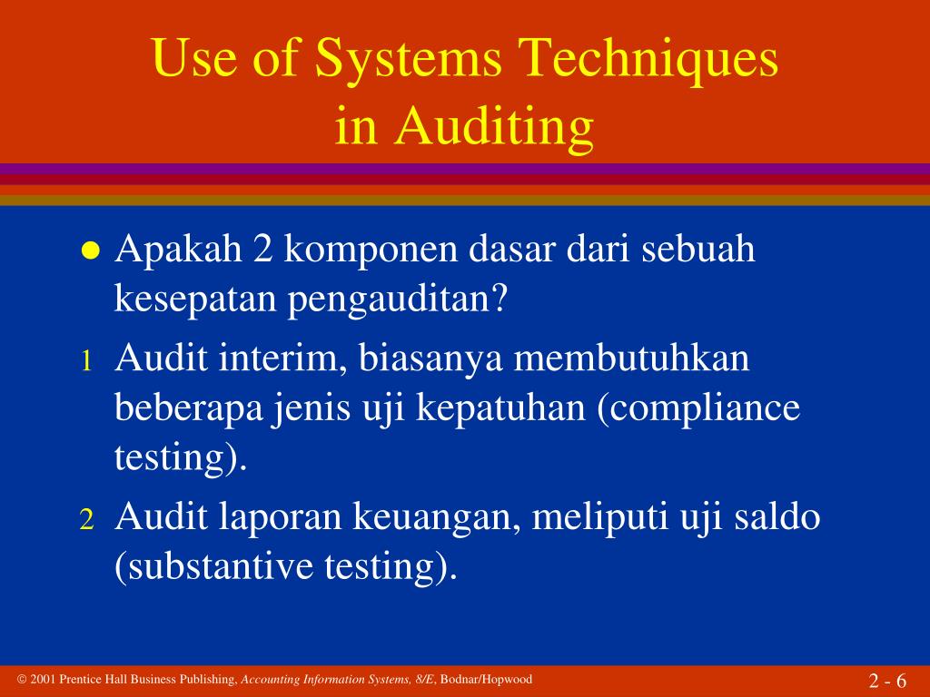 Use of Systems Techniquesin Auditing • Apakah 2 komponen dasar dari sebuah kesepatan pengauditan? • Audit interim, biasanya membutuhkan beberapa jenis uji kepatuhan (compliance testing). • Audit laporan keuangan, meliputi uji saldo (substantive testing).
