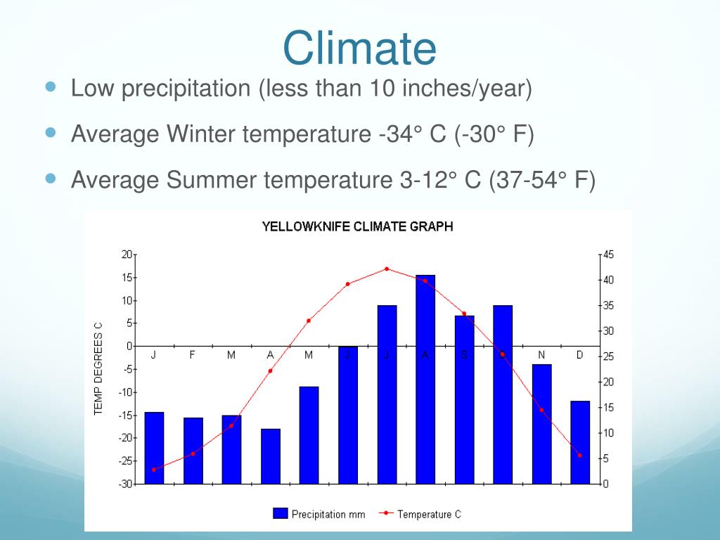 Climate • Low precipitation (less than 10 inches/year) • Average Winter temperature -34° C (-30° F) • Average Summer temperature 3-12° C (37-54° F)