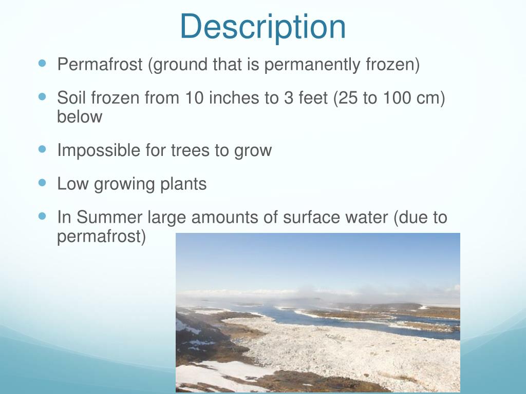 Description • Permafrost (ground that is permanently frozen) • Soil frozen from 10 inches to 3 feet (25 to 100 cm) below • Impossible for trees to grow • Low growing plants • In Summer large amounts of surface water (due to permafrost)