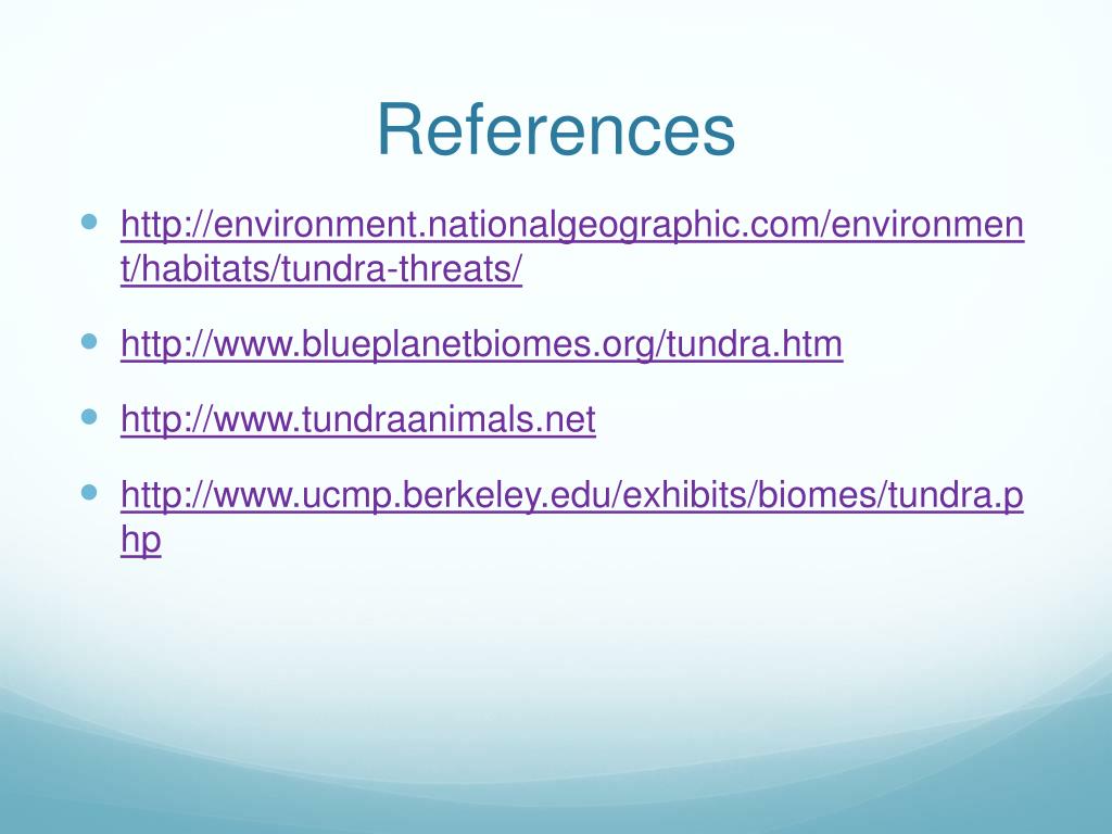 References • http://environment.nationalgeographic.com/environment/habitats/tundra-threats/ • http://www.blueplanetbiomes.org/tundra.htm • http://www.tundraanimals.net • http://www.ucmp.berkeley.edu/exhibits/biomes/tundra.php
