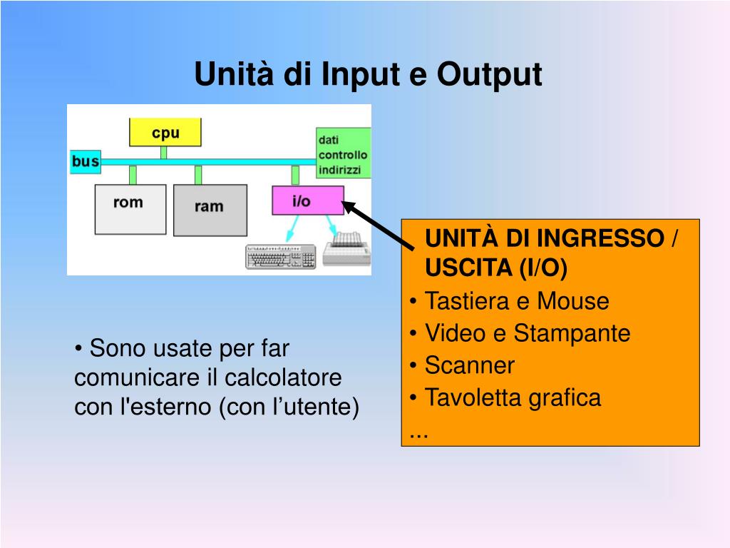 Unità di Input e Output UNITÀ DI INGRESSO / USCITA (I/O) • Tastiera e Mouse • Video e Stampante • Scanner • Tavoletta grafica ... Sono usate per far comunicare il calcolatore con l'esterno (con l’utente)