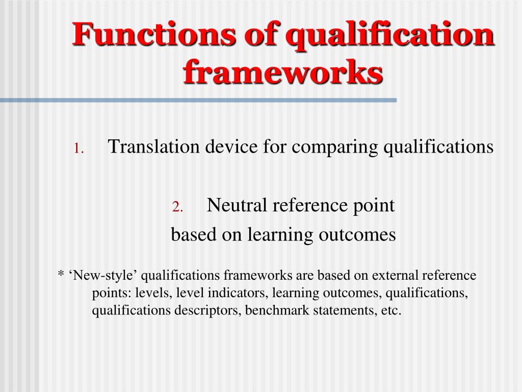 Functions of qualification frameworks • Translation device for comparing qualifications • Neutral reference point based on learning outcomes * ‘New-style’ qualifications frameworks are based on external reference points: levels, level indicators, learning outcomes, qualifications, qualifications descriptors, benchmark statements, etc.