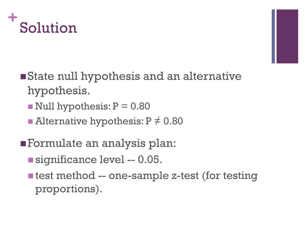 Solution • State null hypothesis and an alternative hypothesis. • Null hypothesis: P = 0.80 • Alternative hypothesis: P ≠ 0.80 • Formulate an analysis plan: • significance level -- 0.05. • test method -- one-sample z-test (for testing proportions).