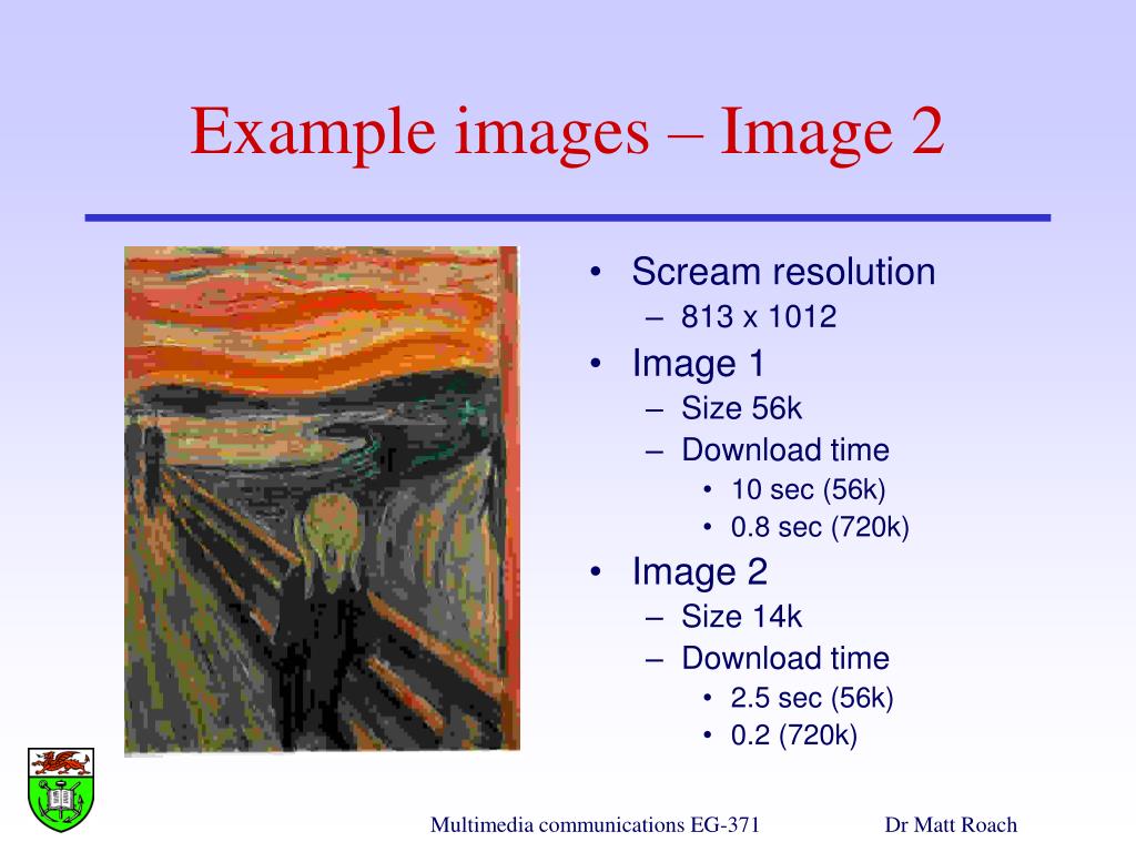 Scream resolution 813 x 1012 Image 1 Size 56k Download time 10 sec (56k) 0.8 sec (720k) Image 2 Size 14k Download time 2.5 sec (56k) 0.2 (720k) Example images – Image 1 Multimedia communications EG-371 Dr Matt Roach