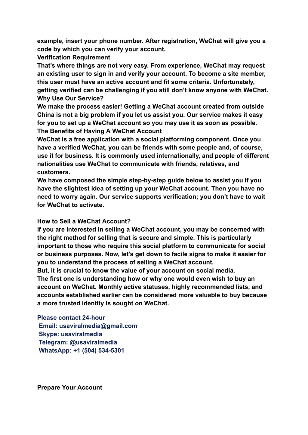 example, insert your phone number. After registration, WeChat will give you a code by which you can verify your account. Verification Requirement That’s where things are not very easy. From experience, WeChat may request an existing user to sign in and verify your account. To become a site member, this user must have an active account and fit some criteria. Unfortunately, getting verified can be challenging if you still don’t know anyone with WeChat. Why Use Our Service? We make the process easier! Getting a WeChat account created from outside China is not a big problem if you let us assist you. Our service makes it easy for you to set up a WeChat account so you may use it as soon as possible. The Benefits of Having A WeChat Account WeChat is a free application with a social platforming component. Once you have a verified WeChat, you can be friends with some people and, of course, use it for business. It is commonly used internationally, and people of different nationalities use WeChat to communicate with friends, relatives, and customers. We have composed the simple step-by-step guide below to assist you if you have the slightest idea of setting up your WeChat account. Then you have no need to worry again. Our service supports verification; you don’t have to wait for WeChat to activate. How to Sell a WeChat Account? If you are interested in selling a WeChat account, you may be concerned with the right method for selling that is secure and simple. This is particularly important to those who require this social platform to communicate for social or business purposes. Now, let’s get down to facile signs to make it easier for you to understand the process of selling a WeChat account. But, it is crucial to know the value of your account on social media. The first one is understanding how or why one would even wish to buy an account on WeChat. Monthly active statuses, highly recommended lists, and accounts established earlier can be considered more valuable to buy because a more trusted identity is sought on WeChat. Please contact 24-hour Email: usaviralmedia@gmail.com Skype: usaviralmedia Telegram: @usaviralmedia WhatsApp: +1 (504) 534-5301 Prepare Your Account