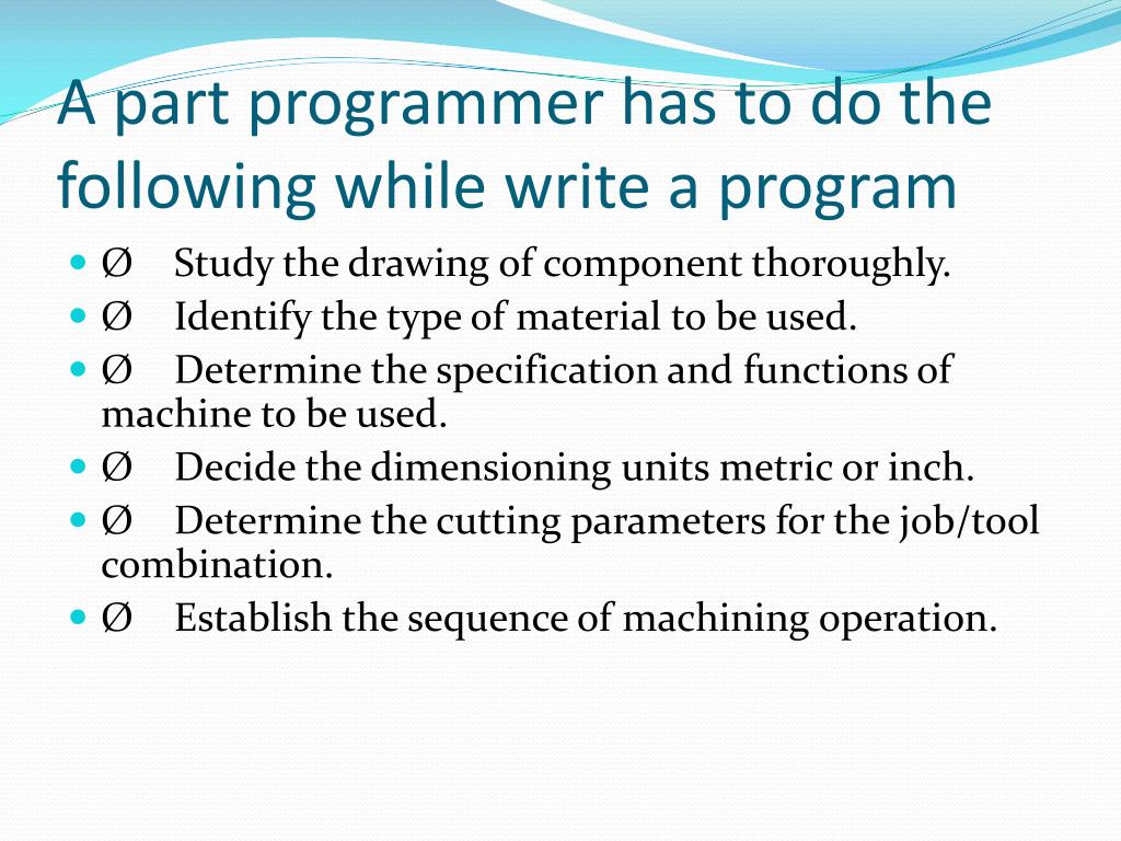 A part programmer has to do the following while write a program • Ø Study the drawing of component thoroughly. • Ø Identify the type of material to be used. • Ø Determine the specification and functions of machine to be used. • Ø Decide the dimensioning units metric or inch. • Ø Determine the cutting parameters for the job/tool combination. • Ø Establish the sequence of machining operation.