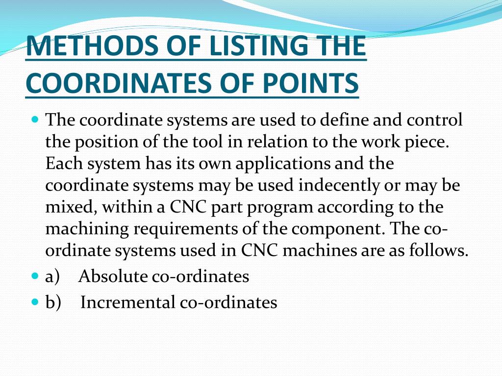 METHODS OF LISTING THE COORDINATES OF POINTS • The coordinate systems are used to define and control the position of the tool in relation to the work piece. Each system has its own applications and the coordinate systems may be used indecently or may be mixed, within a CNC part program according to the machining requirements of the component. The co-ordinate systems used in CNC machines are as follows. • a) Absolute co-ordinates • b) Incremental co-ordinates