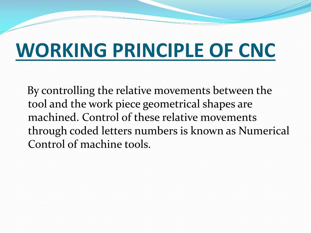 WORKING PRINCIPLE OF CNC By controlling the relative movements between the tool and the work piece geometrical shapes are machined. Control of these relative movements through coded letters numbers is known as Numerical Control of machine tools.