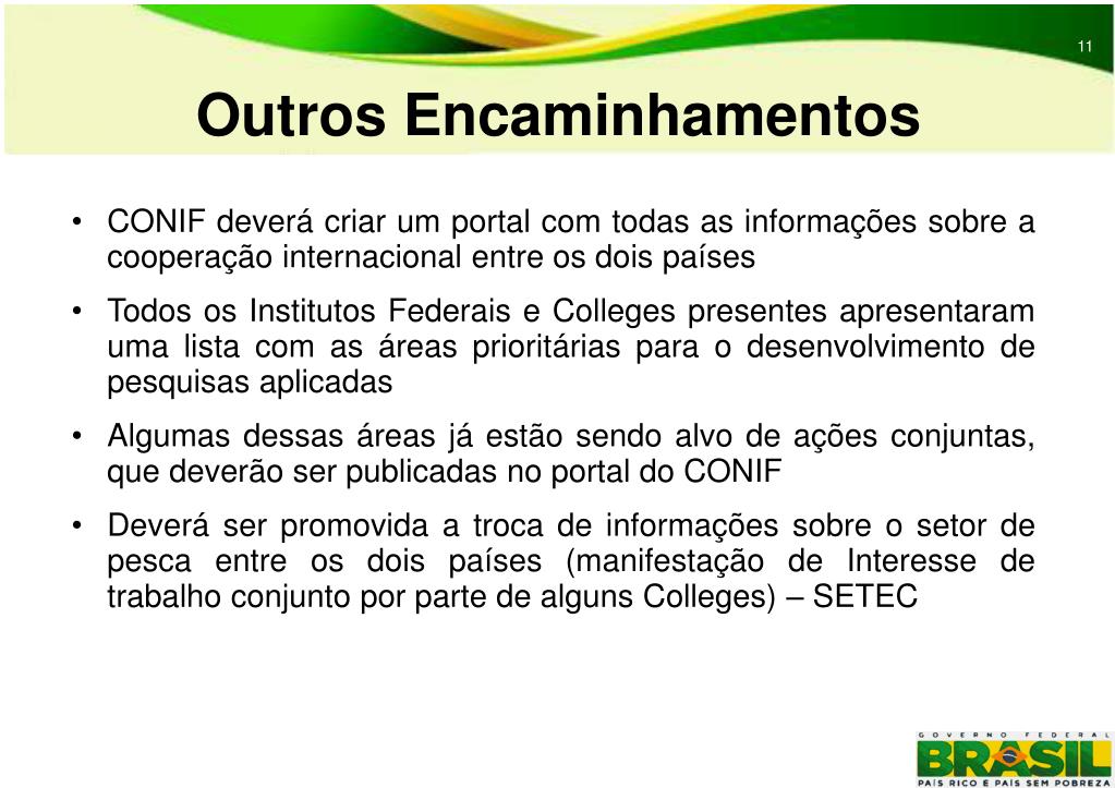 11 Outros Encaminhamentos • CONIF deverá criar um portal com todas as informações sobre a cooperação internacional entre os dois países • Todos os Institutos Federais e Colleges presentes apresentaram uma lista com as áreas prioritárias para o desenvolvimento de pesquisas aplicadas • Algumas dessas áreas já estão sendo alvo de ações conjuntas, que deverão ser publicadas no portal do CONIF • Deverá ser promovida a troca de informações sobre o setor de pesca entre os dois países (manifestação de Interesse de trabalho conjunto por parte de alguns Colleges) – SETEC
