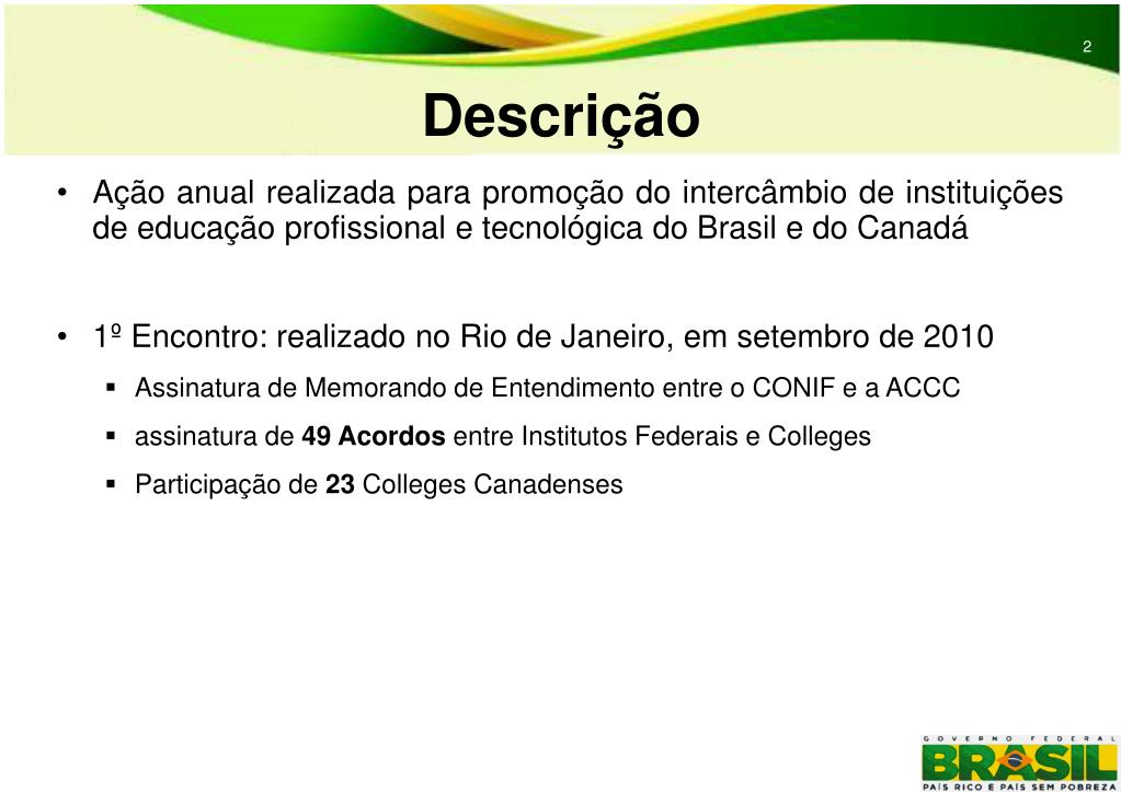 MINISTÉRIO DA EDUCAÇÃO. II Encontro Brasil-Canadá de Educação Profissional e Tecnológica. Novembro de 2011. 2. Descrição. 2. Ação anual realizada para promoção do intercâmbio de instituições de educação profissional e tecnológica do Brasil e do Canadá