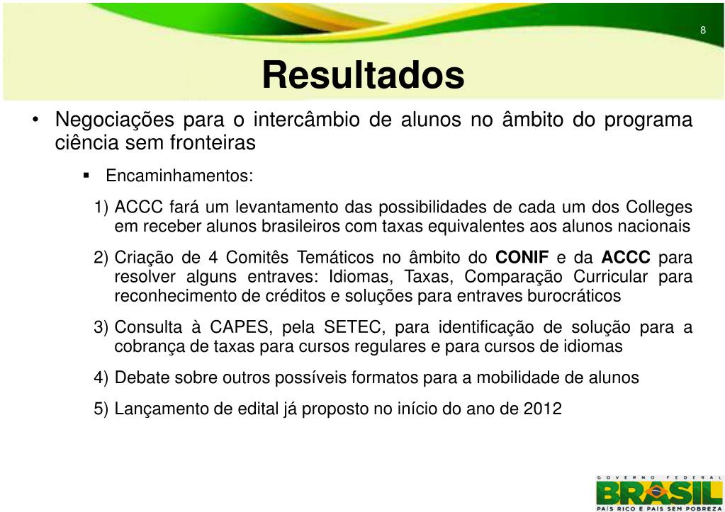 7 Resultados • Negociações para o intercâmbio de alunos no âmbito do programa ciência sem fronteiras • Apresentação das perspectivas de lançamento de edital para tecnólogos sanduíche entre instituições brasileiras e canadenses, tendo como expectativa a participação de até 200 alunos brasileiros e 50 alunos canadenses em 2012 • Facilidades encontradas: alto número de acordos assinados entre as instituições brasileiras e canadenses, antigo relacionamento e conhecimento entre as partes, níveis de ensino com diversas similaridades, similaridades culturais, apoio dos diversos organismos envolvidos • Desafios identificados: alto valor das taxas de alunos internacionais cobradas pelos Colleges, ausência de um Ministério da Educação do lado canadense para centralizar a negociação, baixa reciprocidade devido ao pequeno número de alunos canadenses aptos a estudarem no Brasil, pequeno número de alunos brasileiros com conhecimento de idiomas necessário para realização do intercâmbio