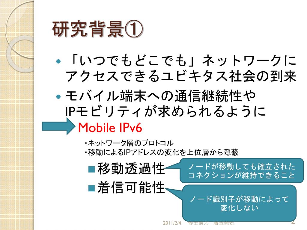 研究背景① • 「いつでもどこでも」ネットワークにアクセスできるユビキタス社会の到来 • モバイル端末への通信継続性や IPモビリティが求められるように Mobile IPv6 ・ネットワーク層のプロトコル ・移動によるIPアドレスの変化を上位層から隠蔽 • 移動透過性 • 着信可能性 ノードが移動しても確立されたコネクションが維持できること ノード識別子が移動によって変化しない 修士論文 審査発表