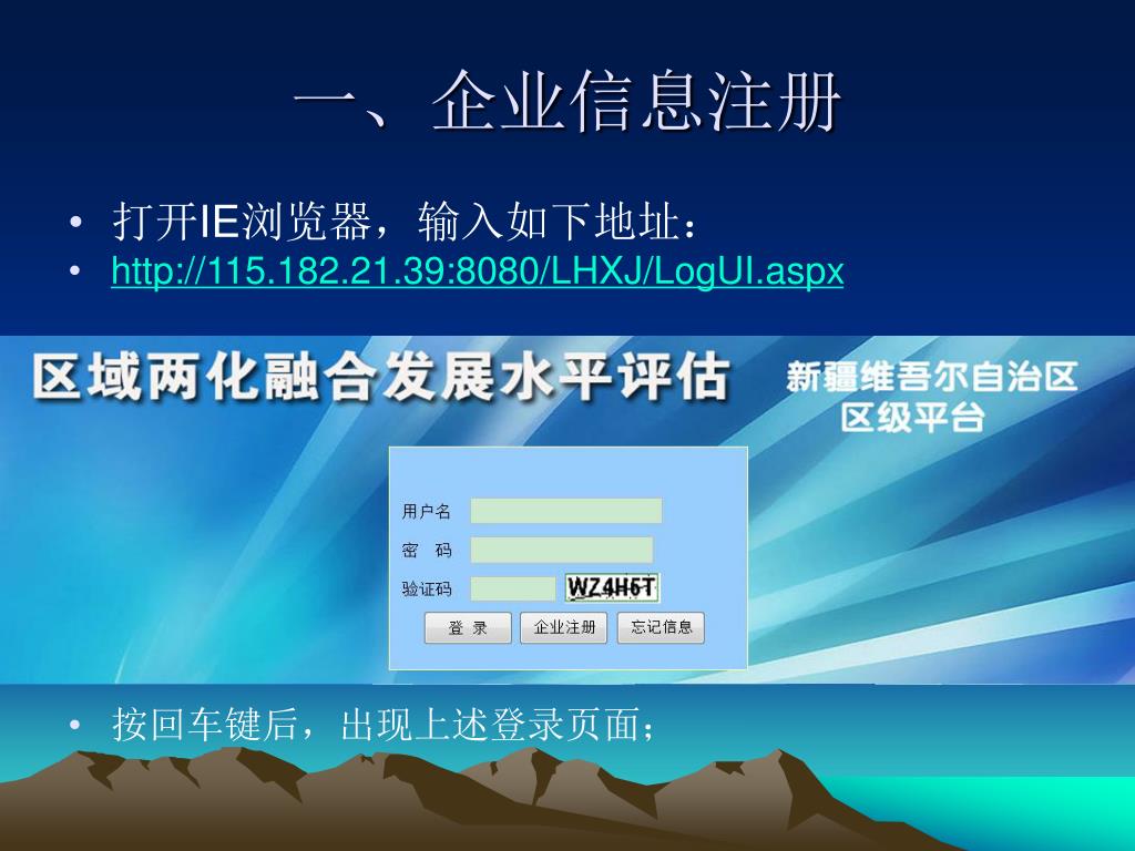 2013 年 “区域两化融合发展水平评估”网上填报系统. 企业填报指南. 填报步骤. 一、企业信息注册 二、数据填报 三、填报数据提交. 一、企业信息注册. 打开 IE 浏览器,输入如下地址: http://115.182.21.39:8080/LHXJ/LogUI.aspx 按回车键后,出现上述登录页面;. 一、企业信息注册. 点击登录页面的”企业注册”按钮,进行注册,注册页如下图所示:. 一、企业信息注册. 所有字段必须全部填写,并且按要求填写正确后,点击页面的提交按钮。. 二、数据填报. 成功注册后,重新打开如下地址: