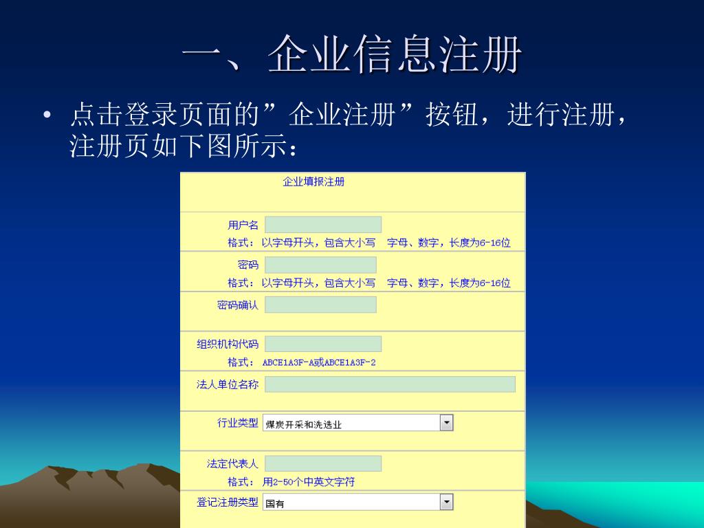 填报步骤 • 一、企业信息注册 • 二、数据填报 • 三、填报数据提交