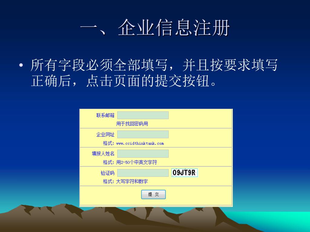 一、企业信息注册 • 所有字段必须全部填写,并且按要求填写正确后,点击页面的提交按钮。