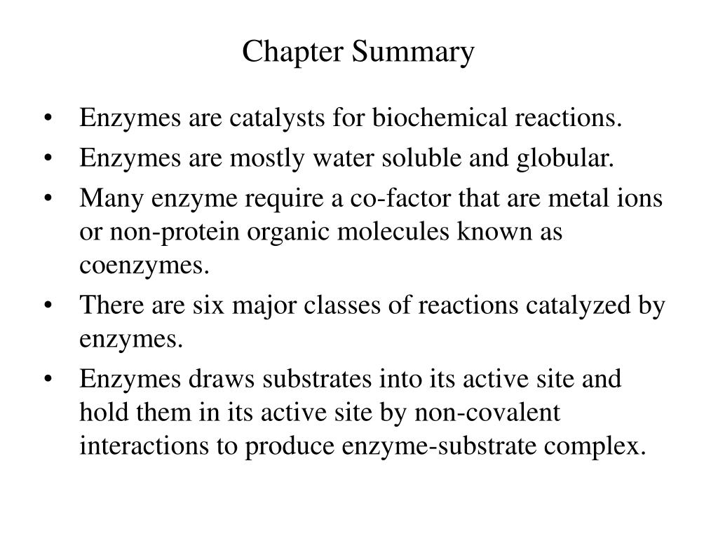 Chapter Summary • Enzymes are catalysts for biochemical reactions. • Enzymes are mostly water soluble and globular. • Many enzyme require a co-factor that are metal ions or non-protein organic molecules known as coenzymes. • There are six major classes of reactions catalyzed by enzymes. • Enzymes draws substrates into its active site and hold them in its active site by non-covalent interactions to produce enzyme-substrate complex.