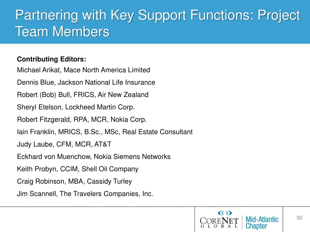Partnering with Key Support Functions: Project Team Members Contributing Editors: Michael Arikat, Mace North America Limited Dennis Blue, Jackson National Life Insurance Robert (Bob) Bull, FRICS, Air New Zealand Sheryl Etelson, Lockheed Martin Corp. Robert Fitzgerald, RPA, MCR, Nokia Corp. Iain Franklin, MRICS, B.Sc., MSc, Real Estate Consultant Judy Laube, CFM, MCR, AT&T Eckhard von Muenchow, Nokia Siemens Networks Keith Probyn, CCIM, Shell Oil Company Craig Robinson, MBA, Cassidy TurleyJim Scannell, The Travelers Companies, Inc. • CoreNet Global LiaisonDavid Heaton, CoreNet Global