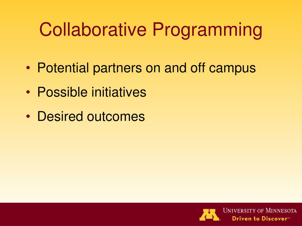 Collaborative Programming • Potential partners on and off campus • Possible initiatives • Desired outcomes