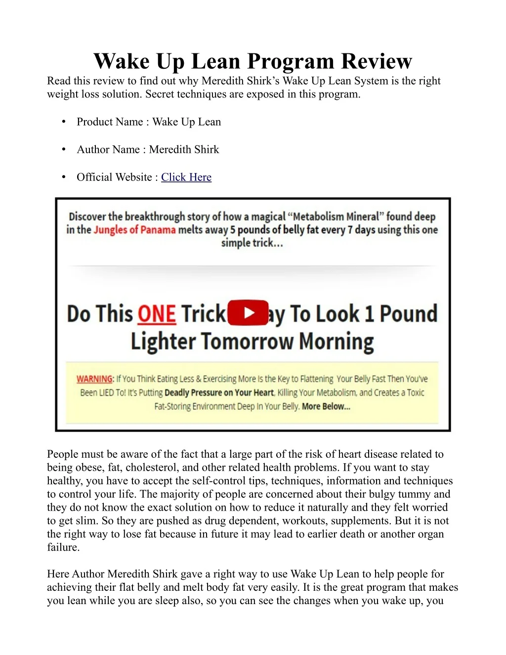 Wake Up Lean Program Review Read this review to find out why Meredith Shirk’s Wake Up Lean System is the right weight loss solution. Secret techniques are exposed in this program. • Product Name : Wake Up Lean • Author Name : Meredith Shirk • Official Website : Click Here People must be aware of the fact that a large part of the risk of heart disease related to being obese, fat, cholesterol, and other related health problems. If you want to stay healthy, you have to accept the self-control tips, techniques, information and techniques to control your life. The majority of people are concerned about their bulgy tummy and they do not know the exact solution on how to reduce it naturally and they felt worried to get slim. So they are pushed as drug dependent, workouts, supplements. But it is not the right way to lose fat because in future it may lead to earlier death or another organ failure. Here Author Meredith Shirk gave a right way to use Wake Up Lean to help people for achieving their flat belly and melt body fat very easily. It is the great program that makes you lean while you are sleep also, so you can see the changes when you wake up, you