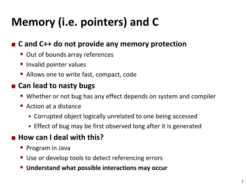 Carnegie Mellon Memory (i.e. pointers) and C • C and C++ do not provide any memory protection • Out of bounds array references • Invalid pointer values • Allows one to write fast, compact, code • Can lead to nasty bugs • Whether or not bug has any effect depends on system and compiler • Action at a distance • Corrupted object logically unrelated to one being accessed • Effect of bug may be first observed long after it is generated • How can I deal with this? • Program in Java • Use or develop tools to detect referencing errors • Understand what possible interactions may occur
