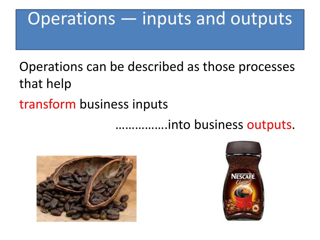 Operations — inputs and outputs Operations can be described as those processes that help transformbusiness inputs …………….into business outputs.