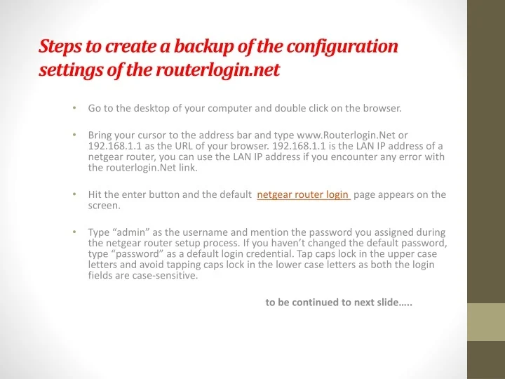 Steps to create a backup of the configuration settings of the routerlogin.net Go to the desktop of your computer and double click on the browser. Bring your cursor to the address bar and type www.Routerlogin.Net or 192.168.1.1 as the URL of your browser. 192.168.1.1 is the LAN IP address of a netgear router, you can use the LAN IP address if you encounter any error with the routerlogin.Net link. Hit the enter button and the default netgear router login page appears on the screen. Type “admin” as the username and mention the password you assigned during the netgear router setup process. If you haven’t changed the default password, type “password” as a default login credential. Tap caps lock in the upper case letters and avoid tapping caps lock in the lower case letters as both the login fields are case-sensitive. to be continued to next slide…..