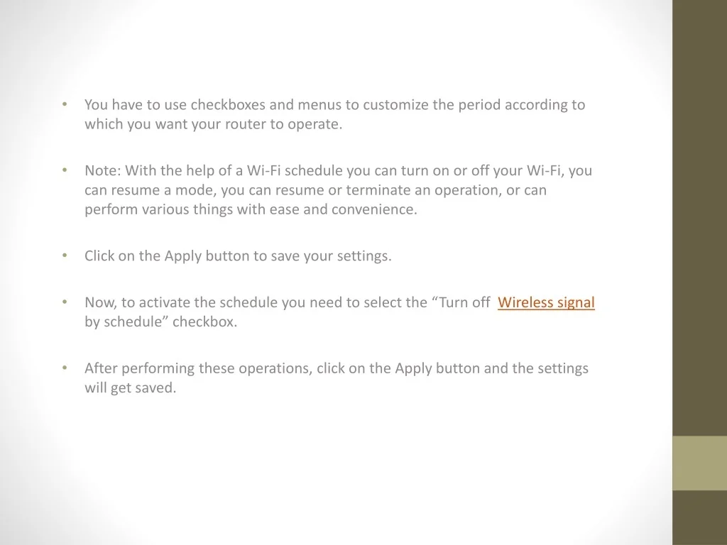 You have to use checkboxes and menus to customize the period according to which you want your router to operate. Note: With the help of a Wi-Fi schedule you can turn on or off your Wi-Fi, you can resume a mode, you can resume or terminate an operation, or can perform various things with ease and convenience. Click on the Apply button to save your settings. Now, to activate the schedule you need to select the “Turn off Wireless signal by schedule” checkbox. After performing these operations, click on the Apply button and the settings will get saved.