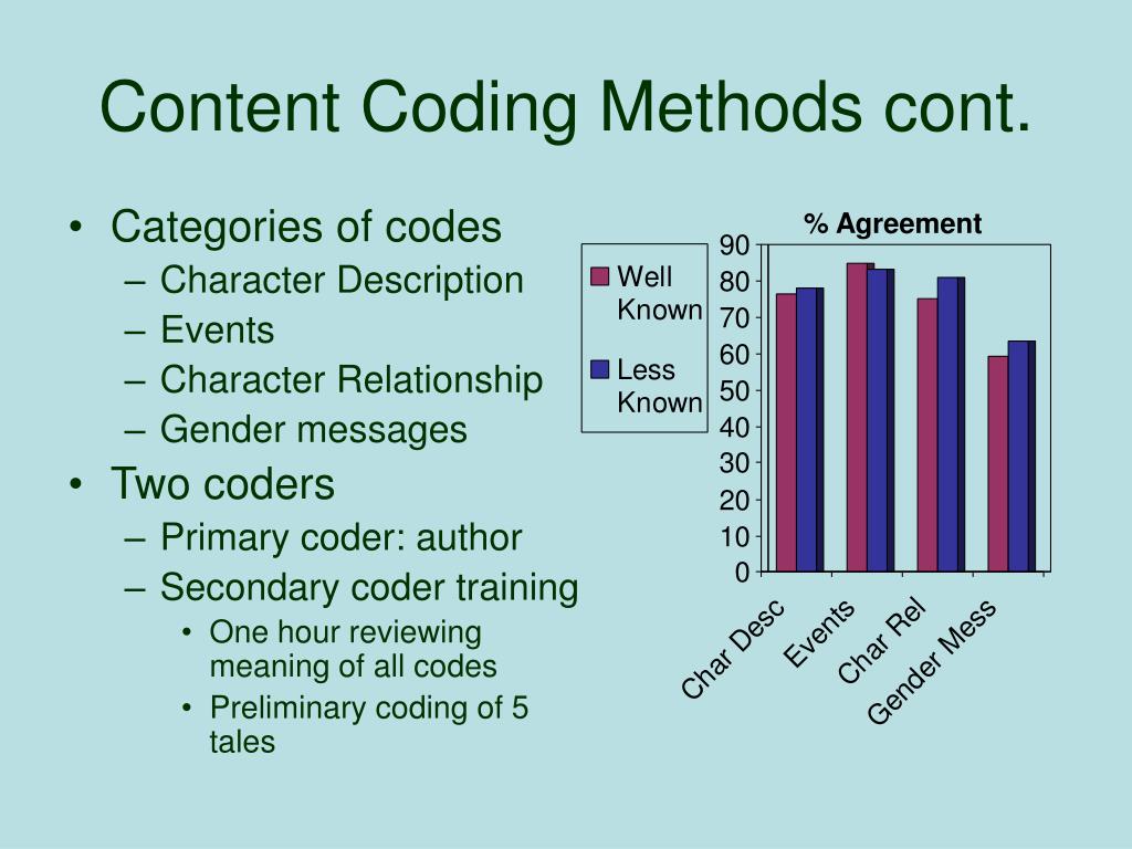 Content Coding Methods cont. Categories of codes Character Description Events Character Relationship Gender messages Two coders Primary coder: author Secondary coder training One hour reviewing meaning of all codes Preliminary coding of 5 tales % Agreement