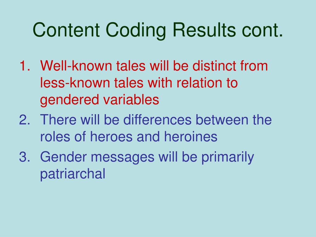 Content Coding Results cont. Well-known tales will be distinct from less-known tales with relation to gendered variables There will be differences between the roles of heroes and heroines Gender messages will be primarily patriarchal