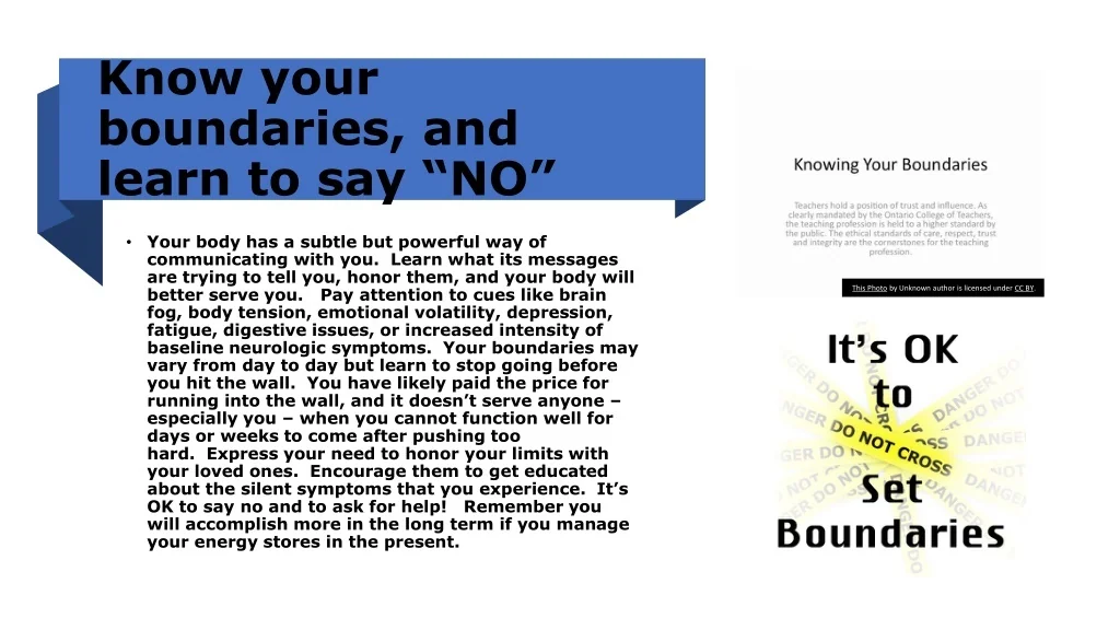 Know your boundaries, and learn to say “NO” • Your body has a subtle but powerful way of communicating with you. Learn what its messages are trying to tell you, honor them, and your body will better serve you. Pay attention to cues like brain fog, body tension, emotional volatility, depression, fatigue, digestive issues, or increased intensity of baseline neurologic symptoms. Your boundaries may vary from day to day but learn to stop going before you hit the wall. You have likely paid the price for running into the wall, and it doesn’t serve anyone – especially you – when you cannot function well for days or weeks to come after pushing too hard. Express your need to honor your limits with your loved ones. Encourage them to get educated about the silent symptoms that you experience. It’s OK to say no and to ask for help! Remember you will accomplish more in the long term if you manage your energy stores in the present. This Photo by Unknown author is licensed under CC BY.