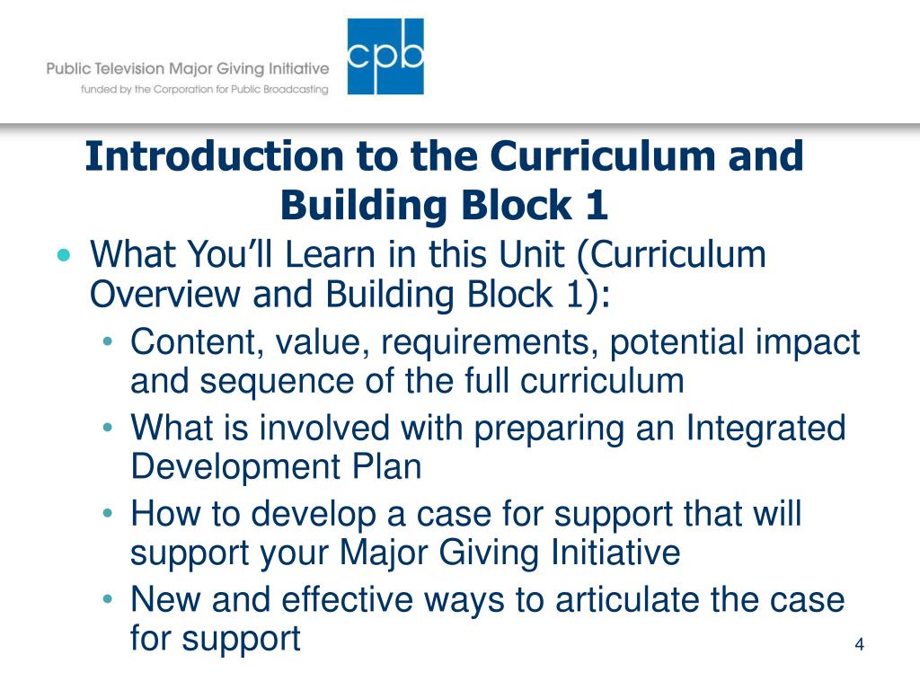 Introduction to the Curriculum and Building Block 1 • What You’ll Learn in this Unit (Curriculum Overview and Building Block 1): • Content, value, requirements, potential impact and sequence of the full curriculum • What is involved with preparing an Integrated Development Plan • How to develop a case for support that will support your Major Giving Initiative • New and effective ways to articulate the case for support