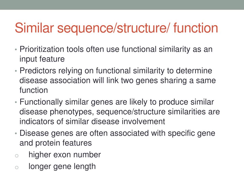 Similar sequence/structure/ function • Prioritization tools often use functional similarity as an input feature • Predictors relying on functional similarity to determine disease association will link two genes sharing a same function • Functionally similar genes are likely to produce similar disease phenotypes, sequence/structure similarities are indicators of similar disease involvement • Disease genes are often associated with specific gene and protein features • higher exon number • longer gene length