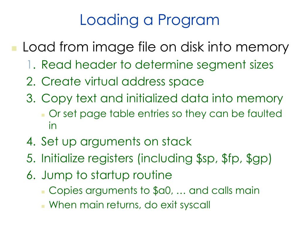 Loading a Program • Load from image file on disk into memory 1. Read header to determine segment sizes 2. Create virtual address space 3. Copy text and initialized data into memory • Or set page table entries so they can be faulted in 4. Set up arguments on stack 5. Initialize registers (including $sp, $fp, $gp) 6. Jump to startup routine • Copies arguments to $a0, … and calls main • When main returns, do exit syscall