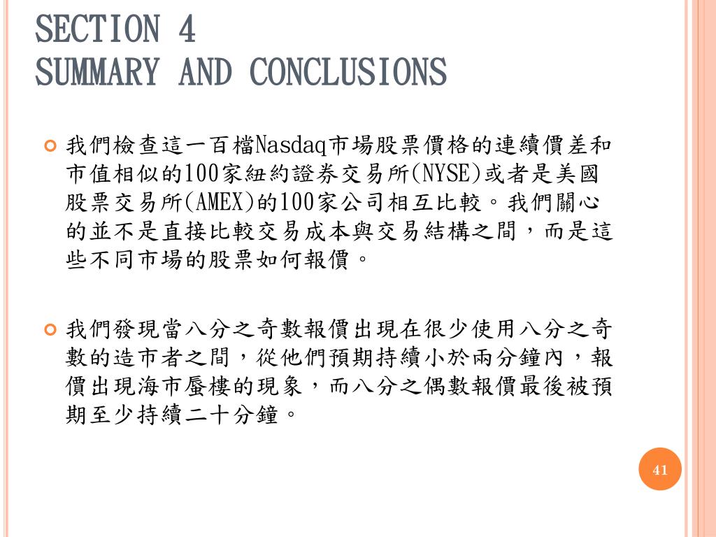 SECTION 4SUMMARY AND CONCLUSIONS • 我們檢查這一百檔Nasdaq市場股票價格的連續價差和市值相似的100家紐約證券交易所(NYSE)或者是美國股票交易所(AMEX)的100家公司相互比較。我們關心的並不是直接比較交易成本與交易結構之間,而是這些不同市場的股票如何報價。 • 我們發現當八分之奇數報價出現在很少使用八分之奇數的造市者之間,從他們預期持續小於兩分鐘內,報價出現海市蜃樓的現象,而八分之偶數報價最後被預期至少持續二十分鐘。