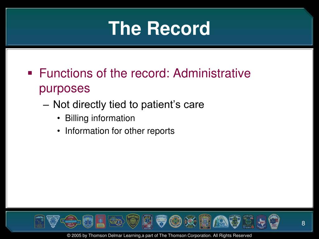 The Record • Functions of the record: Research • Used to improve EMT practice • Identifies what works and what does not work • Helps identify ineffective treatments • Helps underpin particular practice • Suggests ways to improve care