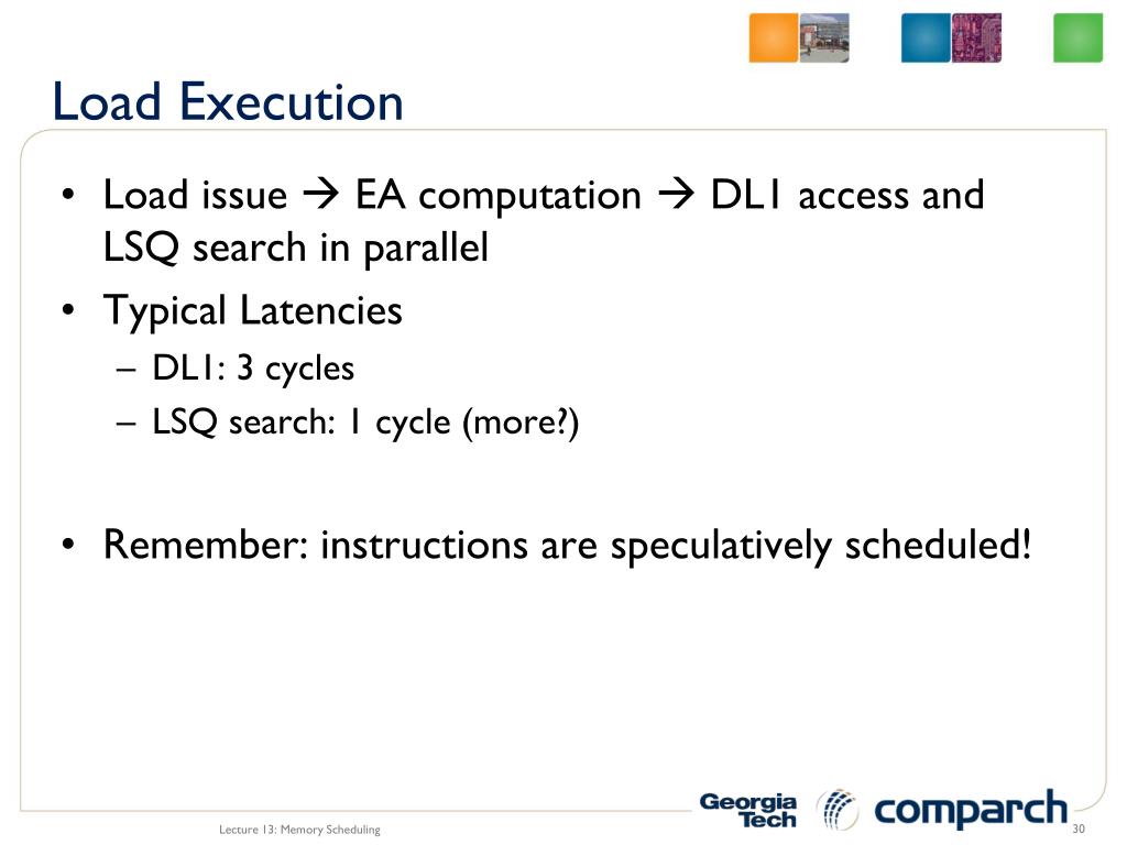 Load Execution • Load issue EA computation DL1 access and LSQ search in parallel • Typical Latencies • DL1: 3 cycles • LSQ search: 1 cycle (more?) • Remember: instructions are speculatively scheduled! Lecture 13: Memory Scheduling