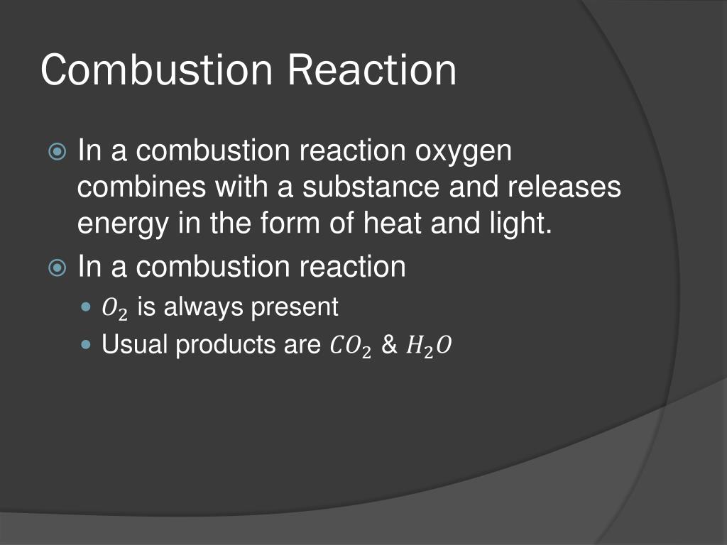 Combustion Reaction • In a combustion reaction oxygen combines with a substance and releases energy in the form of heat and light. • In a combustion reaction • is always present • Usual products are &