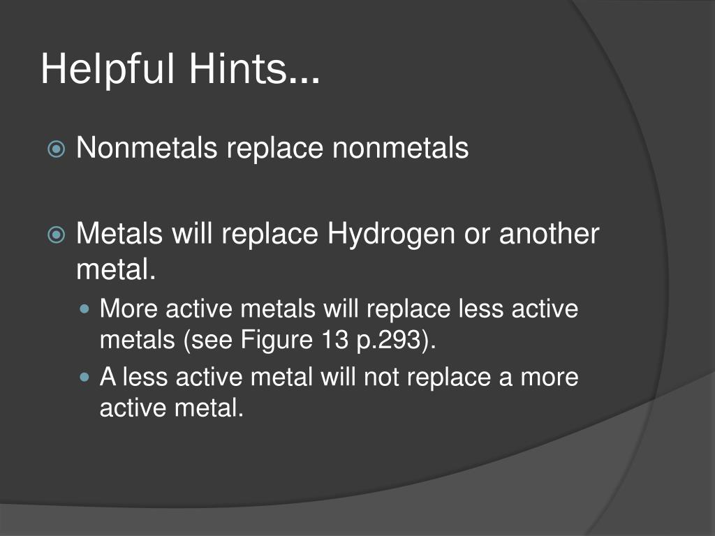 Helpful Hints… • Nonmetals replace nonmetals • Metals will replace Hydrogen or another metal. • More active metals will replace less active metals (see Figure 13 p.293). • A less active metal will not replace a more active metal.