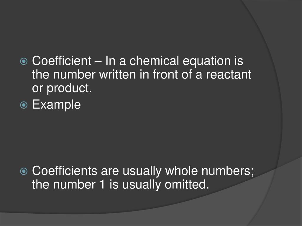 Coefficient – In a chemical equation is the number written in front of a reactant or product. • Example • Coefficients are usually whole numbers; the number 1 is usually omitted.