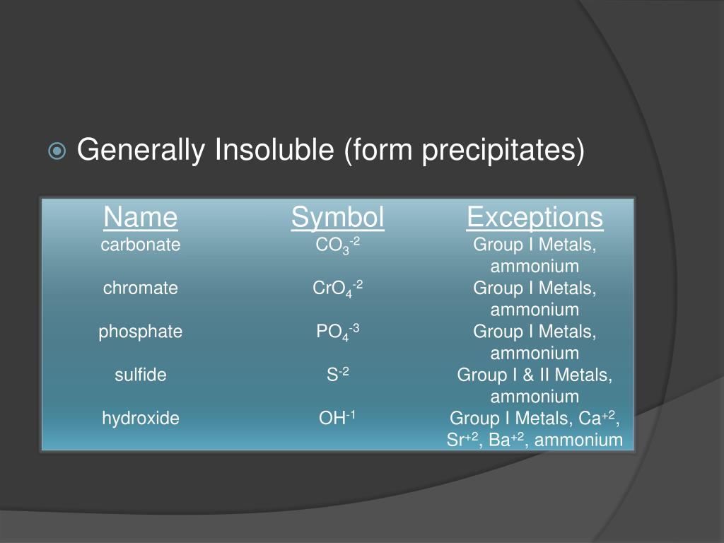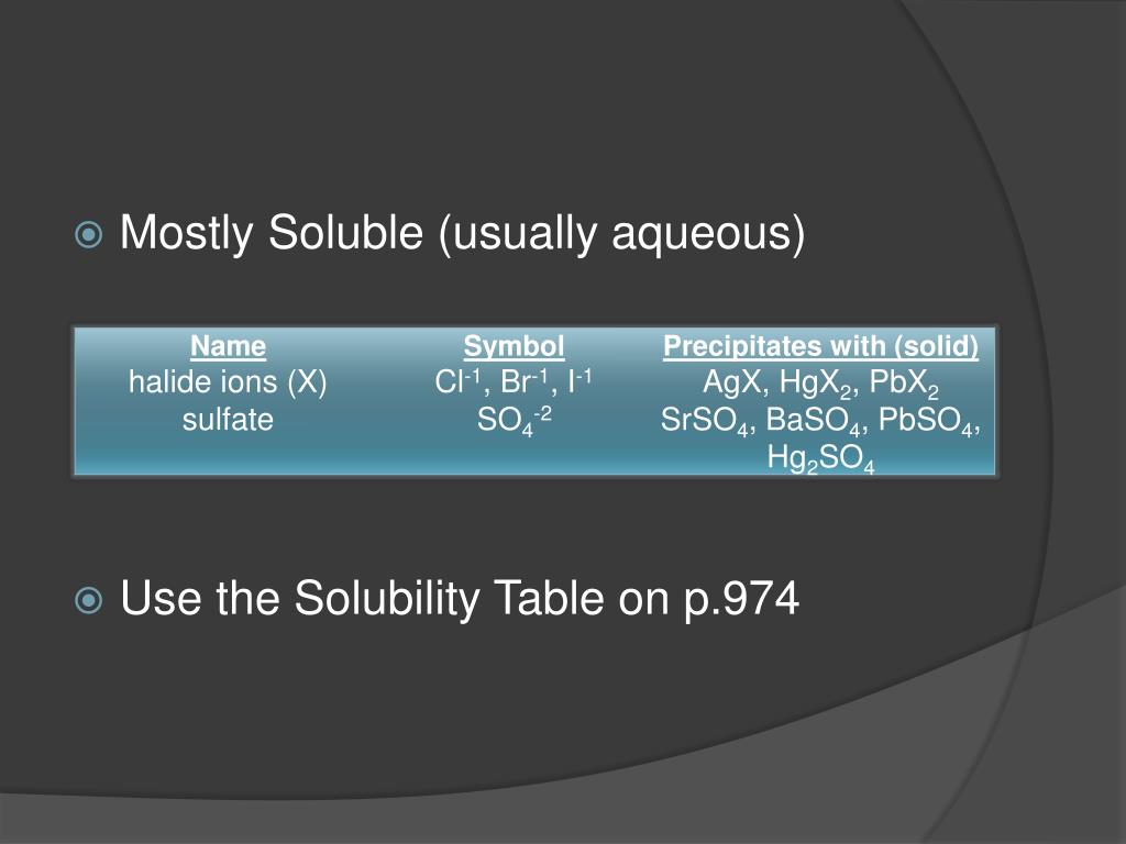 Mostly Soluble (usually aqueous) • Use the Solubility Table on p.974