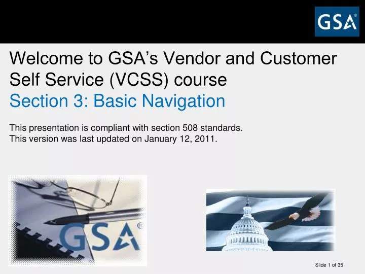 Welcome to GSA’s Vendor and Customer Self Service (VCSS) courseSection 3: Basic Navigation This presentation is compliant with section 508 standards.This version was last updated on January 12, 2011.