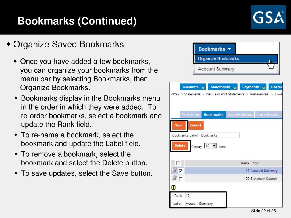Bookmarks (Continued) • Organize Saved Bookmarks • Once you have added a few bookmarks, you can organize your bookmarks from the menu bar by selecting Bookmarks, then Organize Bookmarks. • Bookmarks display in the Bookmarks menu in the order in which they were added. To re-order bookmarks, select a bookmark and update the Rank field. • To re-name a bookmark, select the bookmark and update the Label field. • To remove a bookmark, select the bookmark and select the Delete button. • To save updates, select the Save button.
