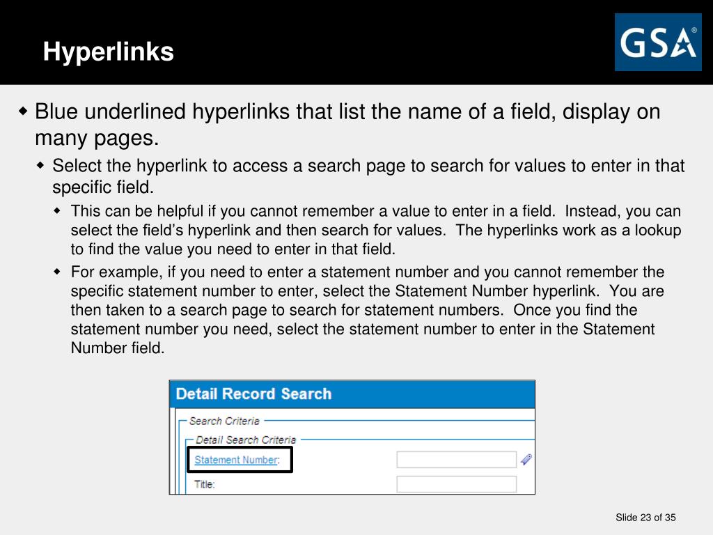 Hyperlinks • Blue underlined hyperlinks that list the name of a field, display on many pages. • Select the hyperlink to access a search page to search for values to enter in that specific field. • This can be helpful if you cannot remember a value to enter in a field. Instead, you can select the field’s hyperlink and then search for values. The hyperlinks work as a lookup to find the value you need to enter in that field. • For example, if you need to enter a statement number and you cannot remember the specific statement number to enter, select the Statement Number hyperlink. You are then taken to a search page to search for statement numbers. Once you find the statement number you need, select the statement number to enter in the Statement Number field.