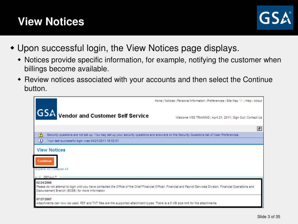 View Notices • Upon successful login, the View Notices page displays. • Notices provide specific information, for example, notifying the customer when billings become available. • Review notices associated with your accounts and then select the Continue button.
