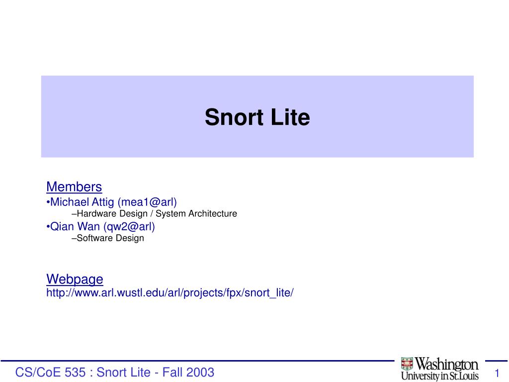 Snort Lite Members Michael Attig (mea1@arl) Hardware Design / System Architecture Qian Wan (qw2@arl) Software Design Webpage http://www.arl.wustl.edu/arl/projects/fpx/snort_lite/