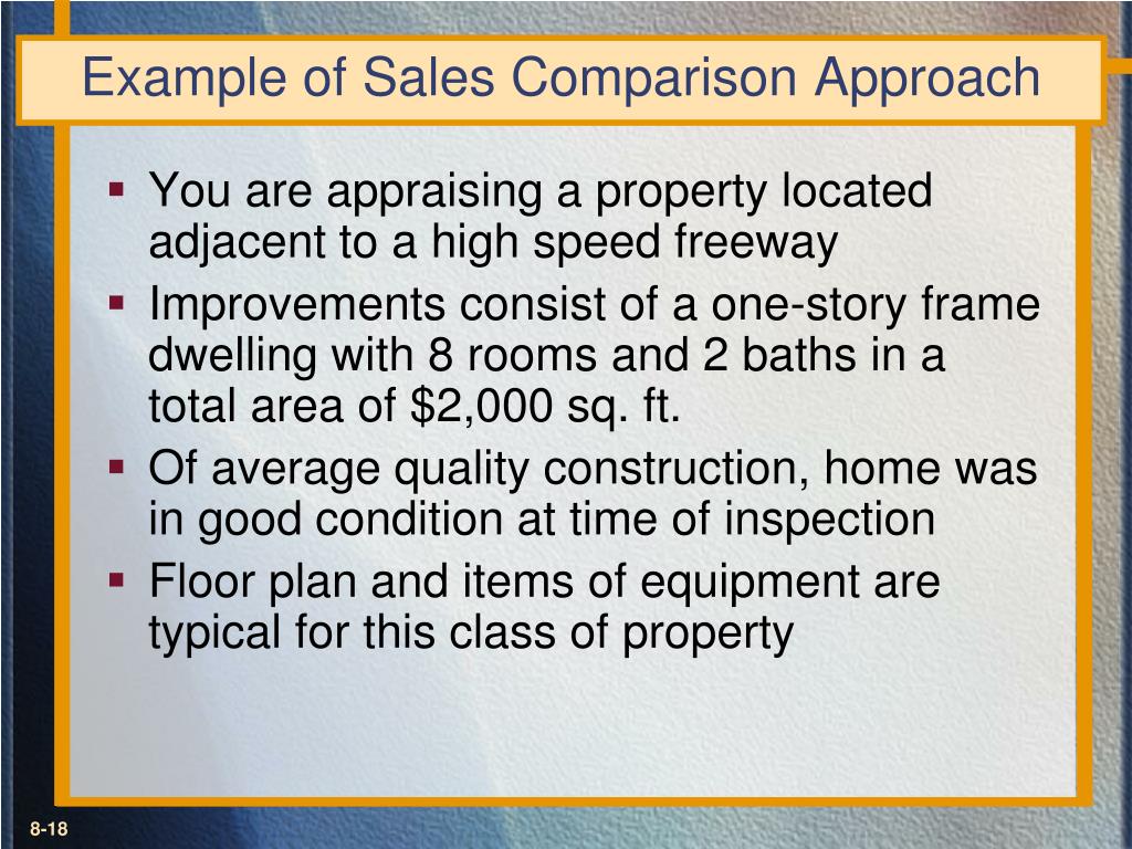 Example of Sales Comparison Approach • You are appraising a property located adjacent to a high speed freeway • Improvements consist of a one-story frame dwelling with 8 rooms and 2 baths in a total area of $2,000 sq. ft. • Of average quality construction, home was in good condition at time of inspection • Floor plan and items of equipment are typical for this class of property